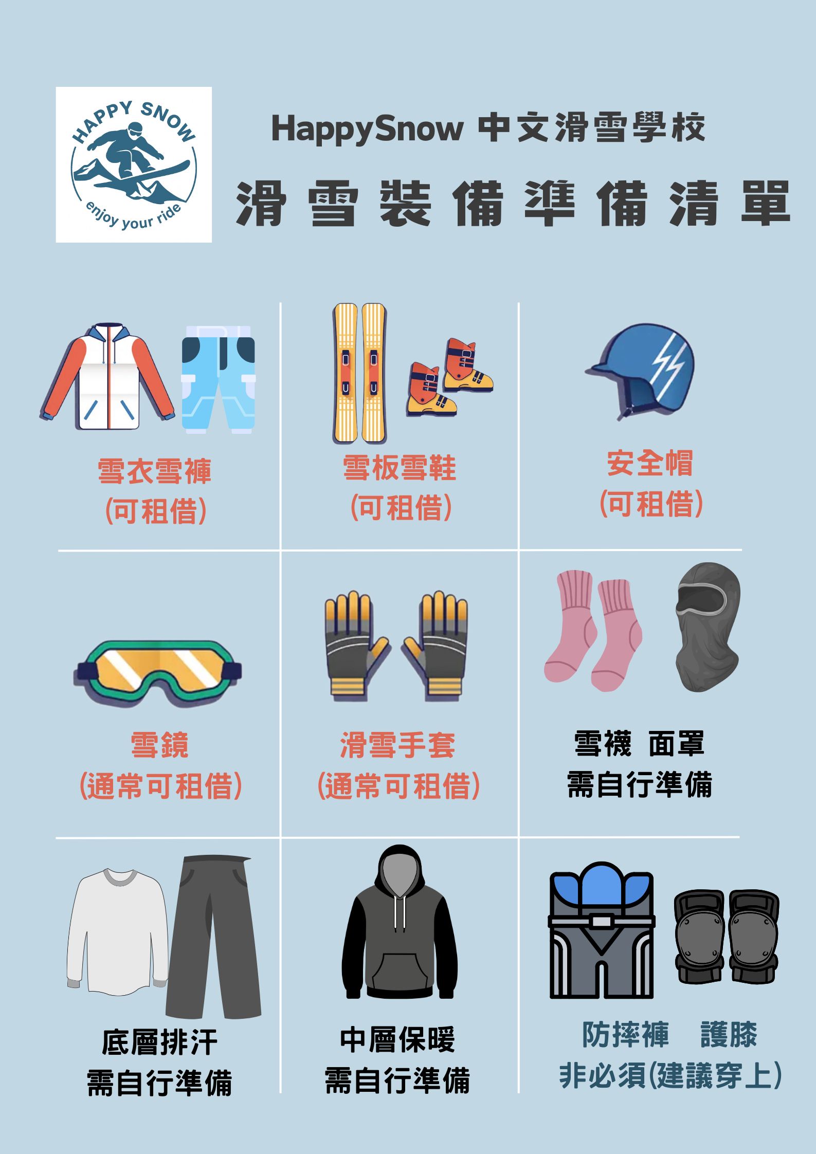 裝備的話雪場都可以租借,如果有需要,教練可以提供協助